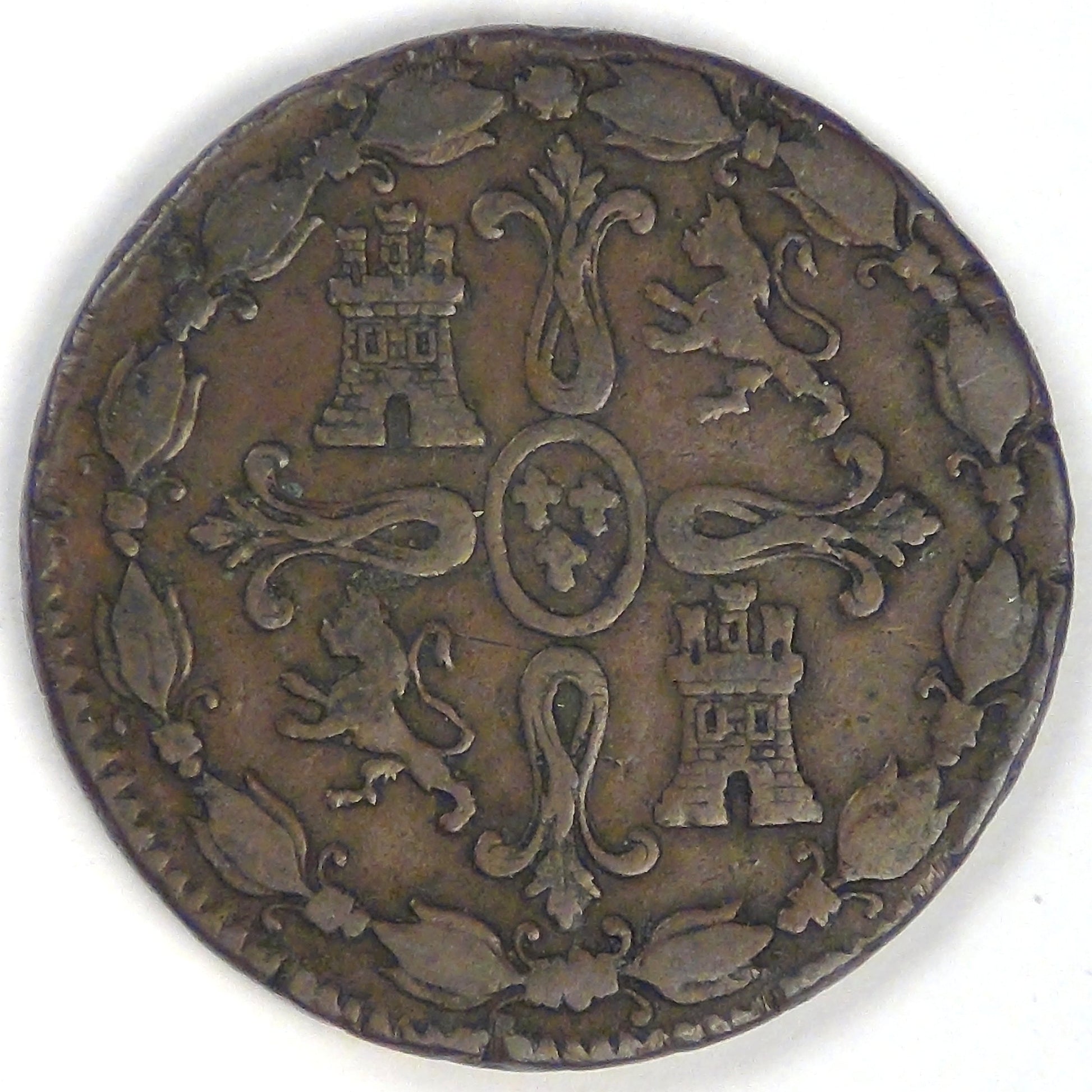 Rev: Cross of Don Pelayo with castles and rampant lions representing the Kingdoms of Castile and Leon, three fleurs-de-lis in a central oval representing the Bourbons, all within wreath