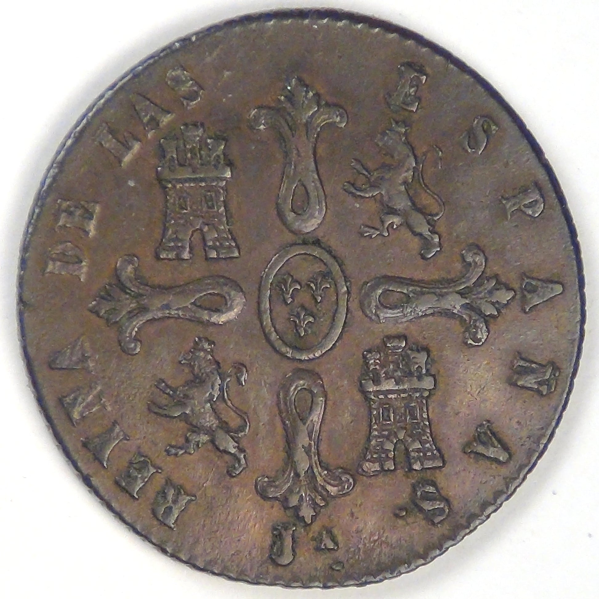 Rev: Cross of Don Pelayo with castles and rampant lions representing the Kingdoms of Castile and Leon, three fleurs-de-lis in a central oval representing the Bourbons, with the legend “Queen of the Spains” around and mint mark JA below