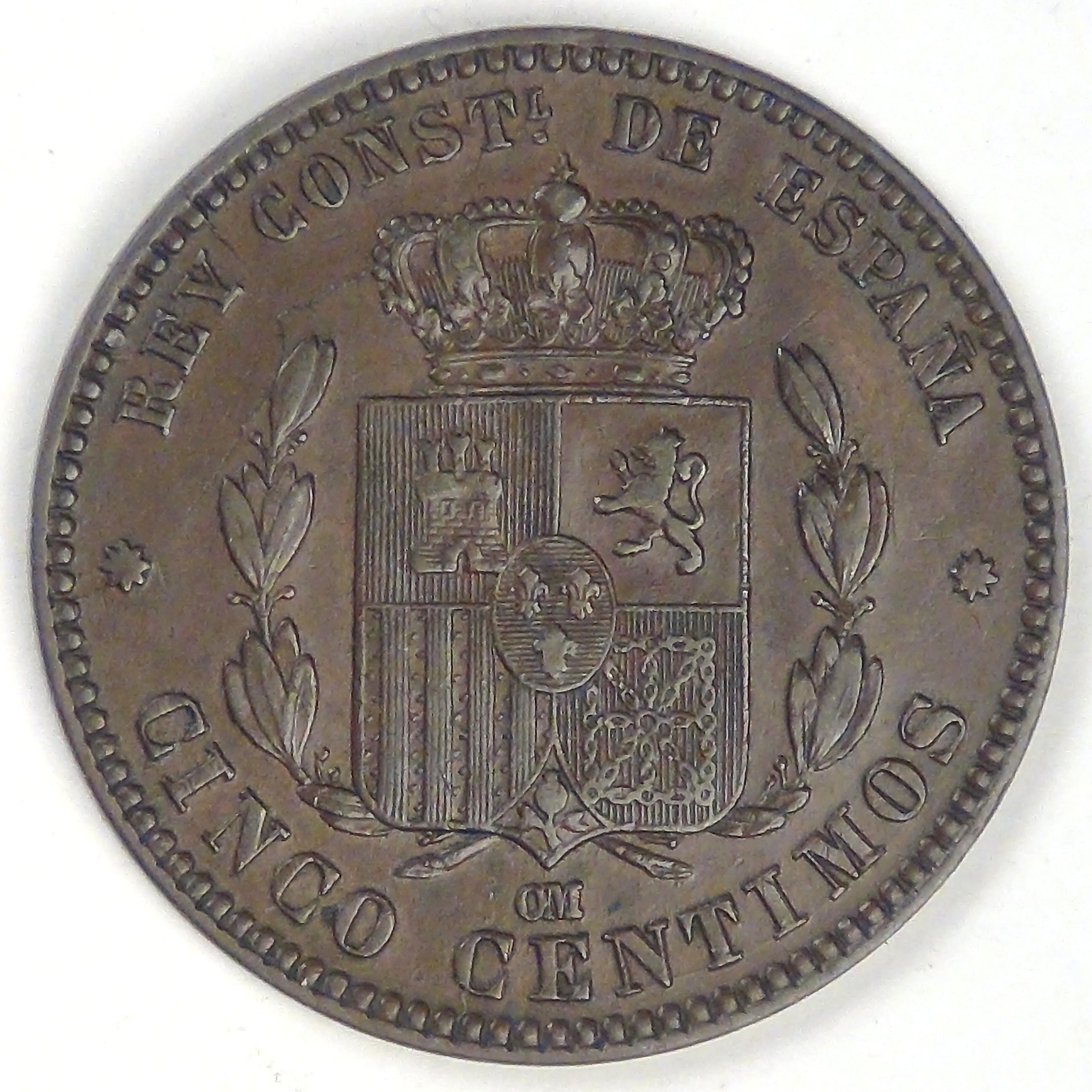 Rev: Crowned coat of arms within wreath, initials OM below, with “Constitutional King of Spain” above and denomination below