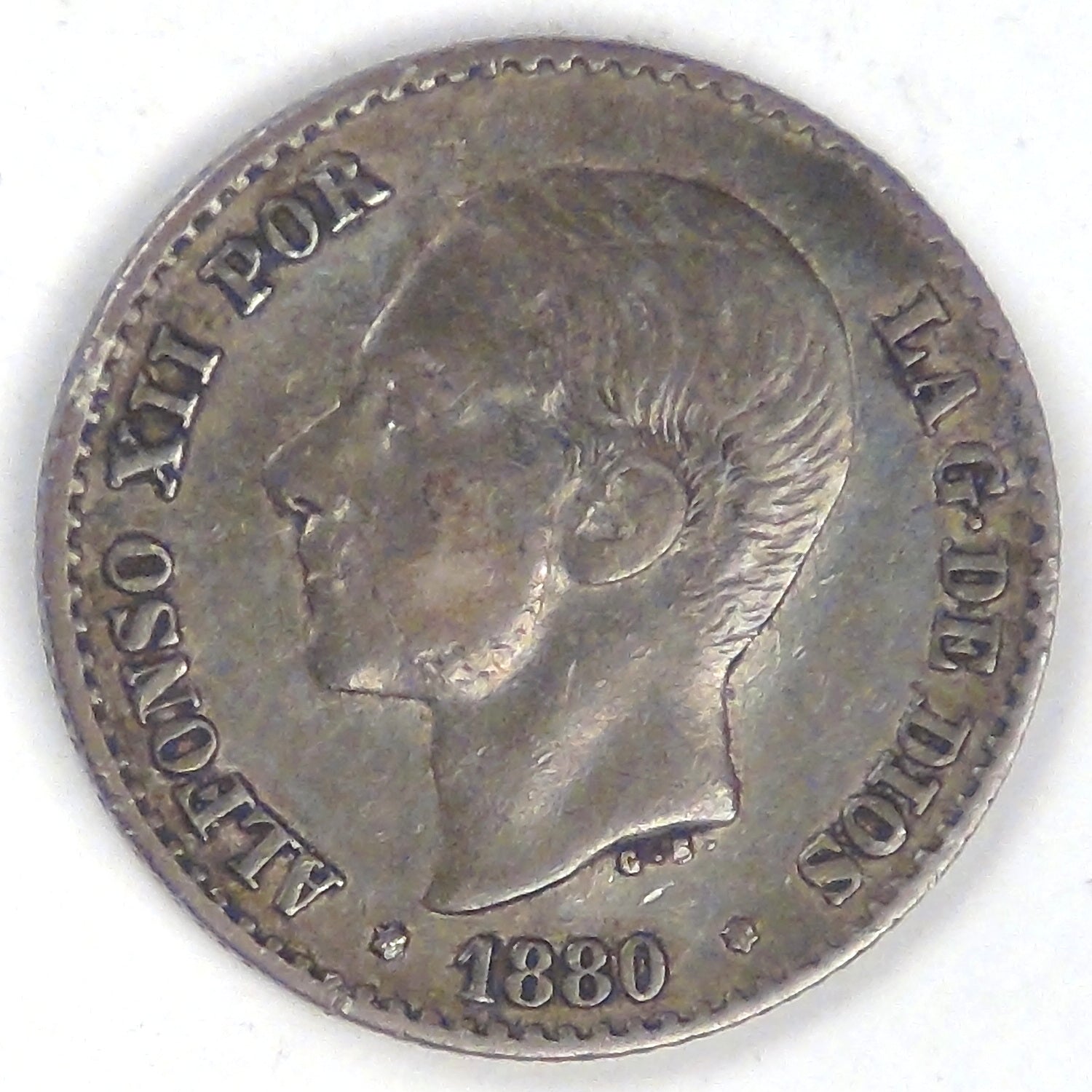 Obv: Head of Alfonso XII left with the legend “Alfonso XII by the grace of God” around and date below flanked by mint marks (6-pointed star) containing the date