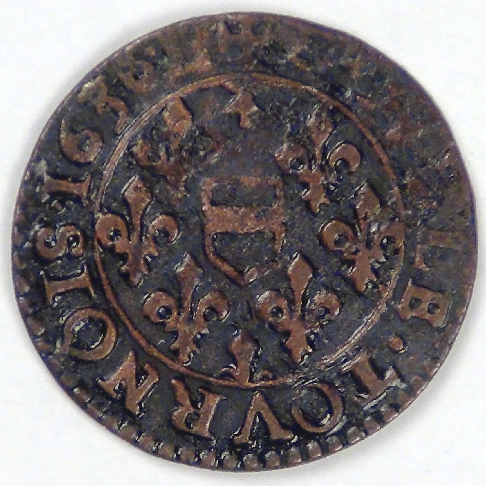 Rev: Shield of Henrichemont in a field of lillies within circle, with the legend “Double Tournois 1636 L” around