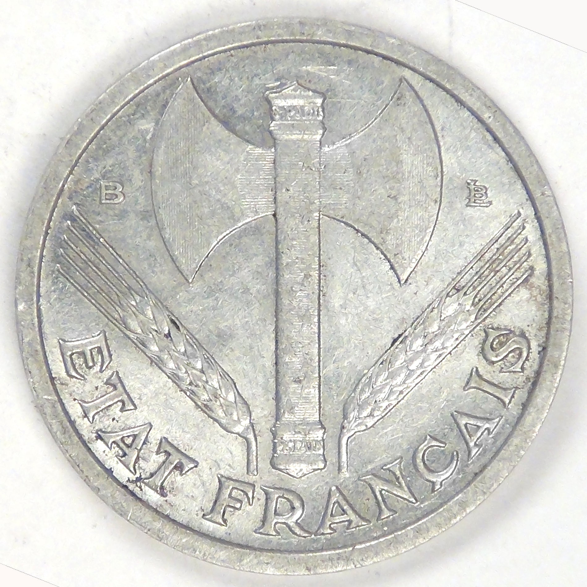 Obv: An axe between two ears of wheat with “French State” below, mint mark B to left