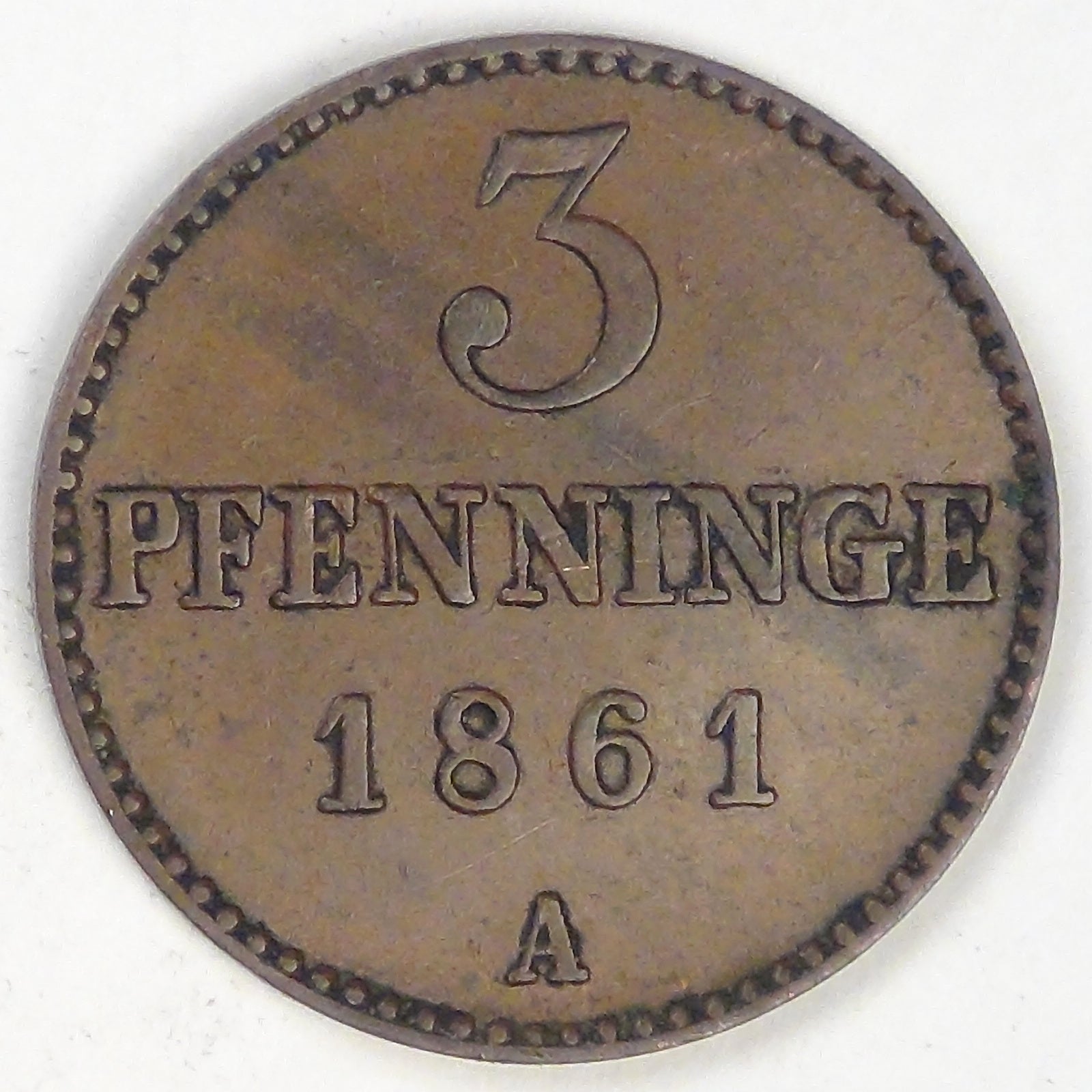 GERMANY - Mecklenburg-Schwerin, Friedrich Franz II, 1861 A, 3 Pfennig, Extra Fine