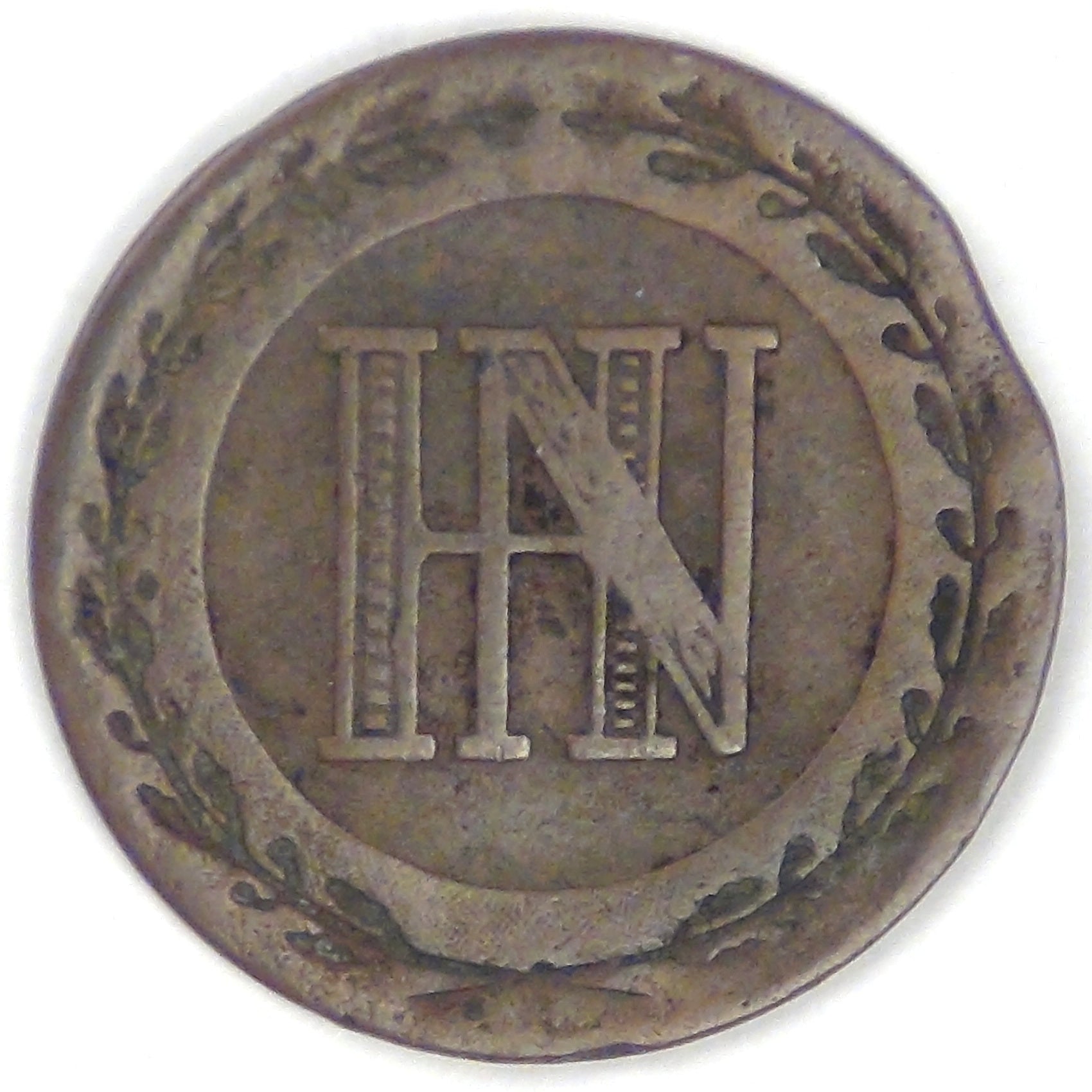 Obv: HN monogram within inner circle, laurel branches surrounding