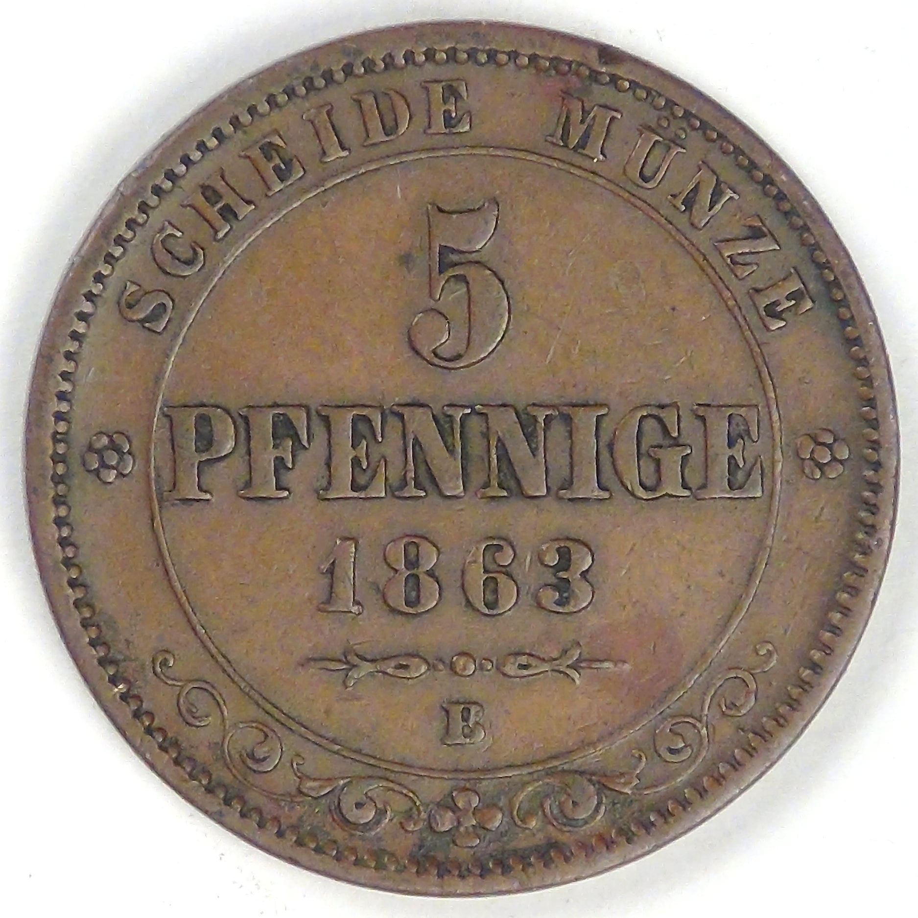 GERMANY - Kingdom of Saxony, Johann I, 1863 B, 5 Pfennige, Choice Very Fine