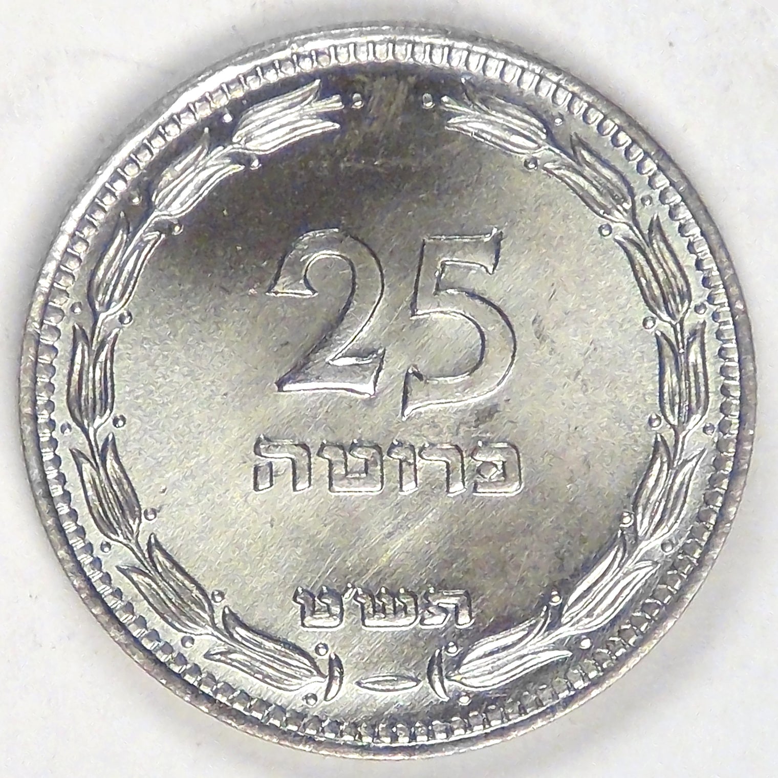 Rev: Denomination and date in Hebrew with two stylized olive branches around