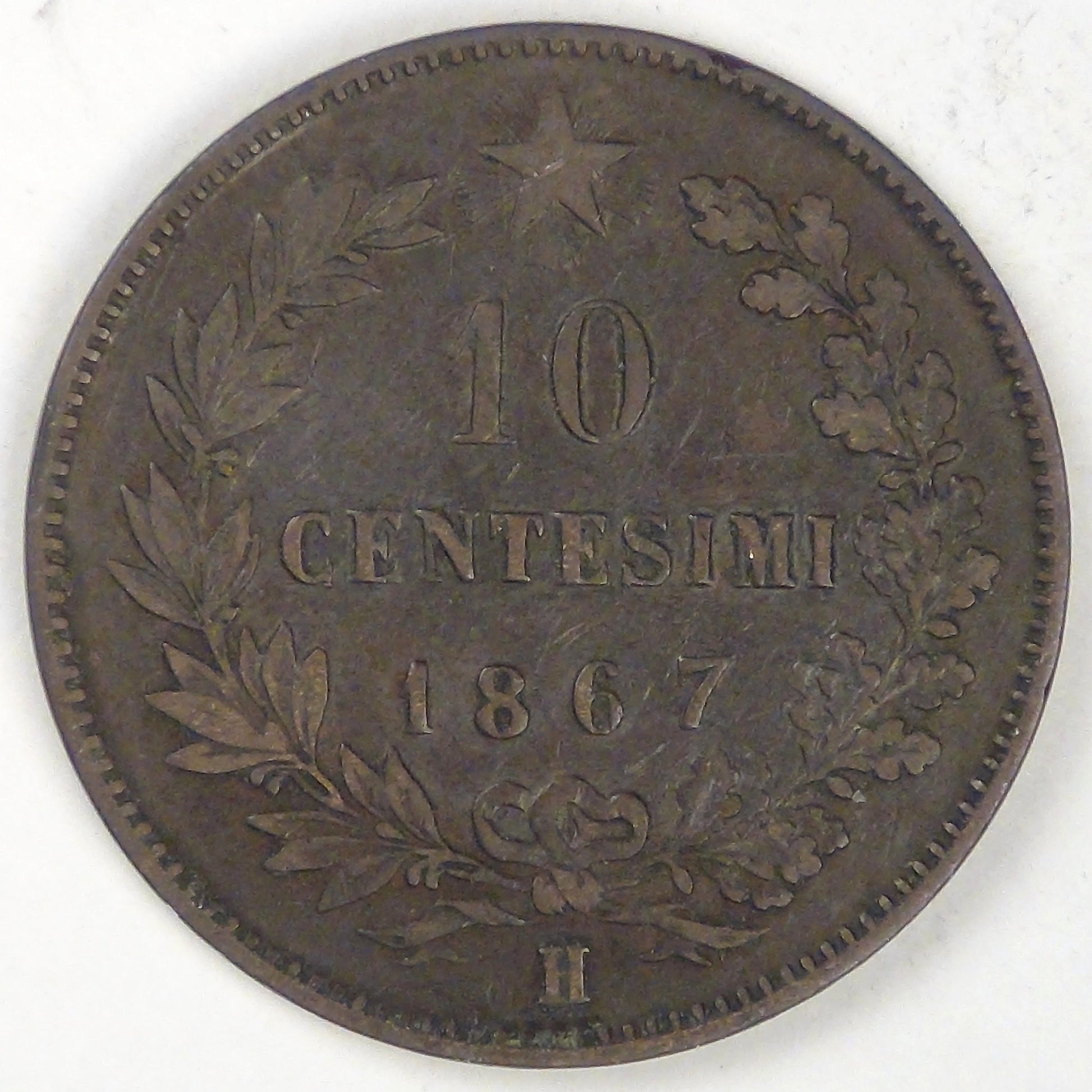 ITALY - Kingdom, Vittorio Emmanuel II, 1867 H, 10 Centesimi, Very Fine
