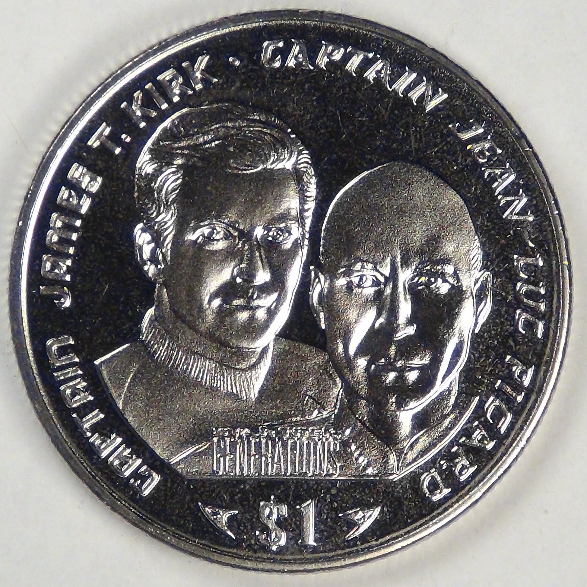 Rev: Conjoined busts of Captain James T. Kirk and Captain Jean-Luc Picard front-facing with names around, domination below flanked by Starfleet Insignia patches