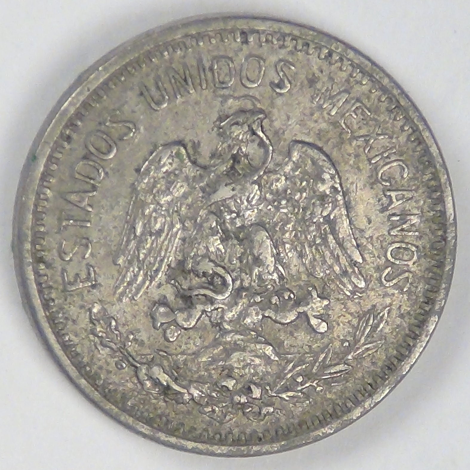 Obv: National arms (eagle right with snake in beak, standing on cactus with laurel and oak branches at bottom) with the legend “United Mexican States” around