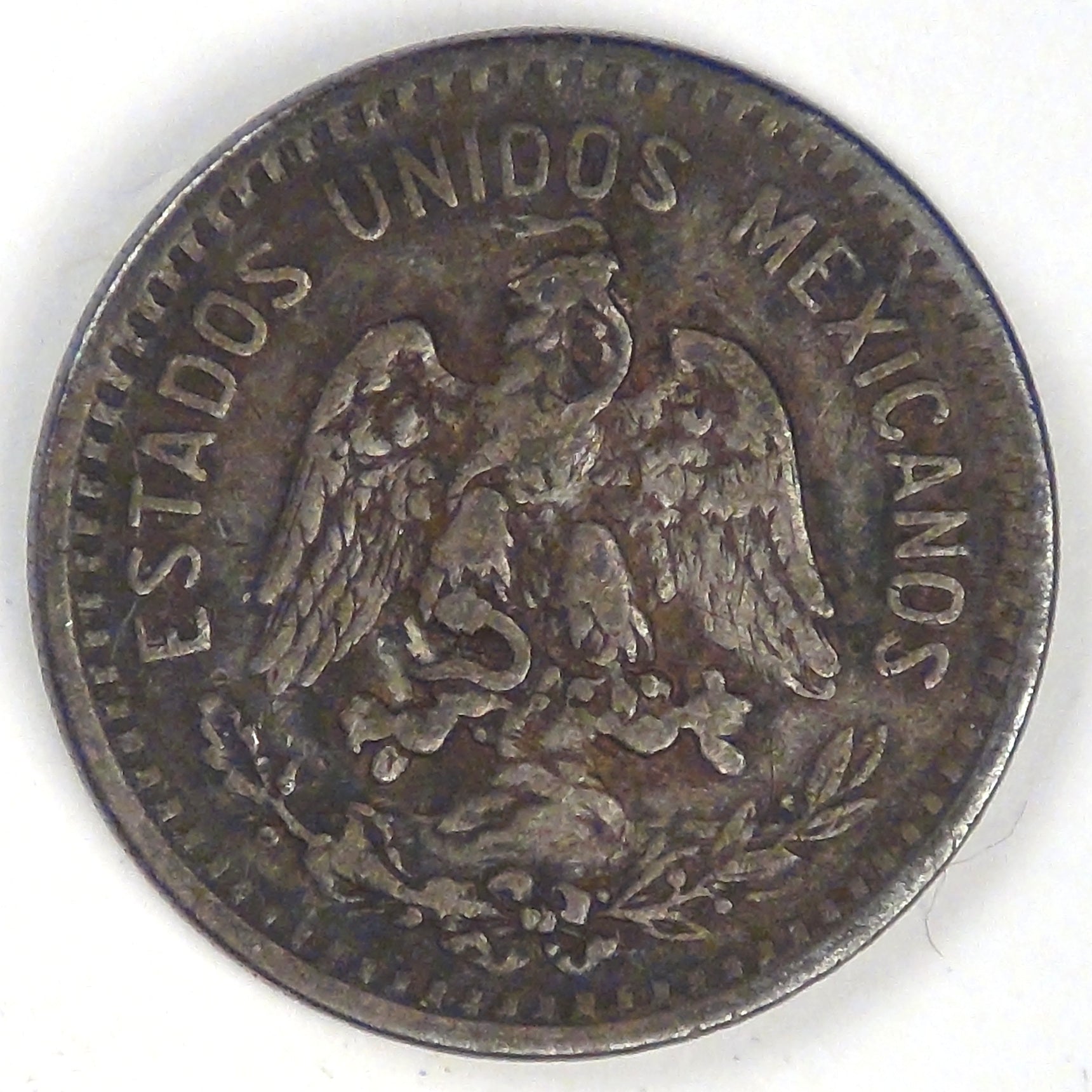 Obv: National arms (eagle left with snake in beak, standing on cactus with laurel and oak branches at bottom) with the legend “United Mexican States” around