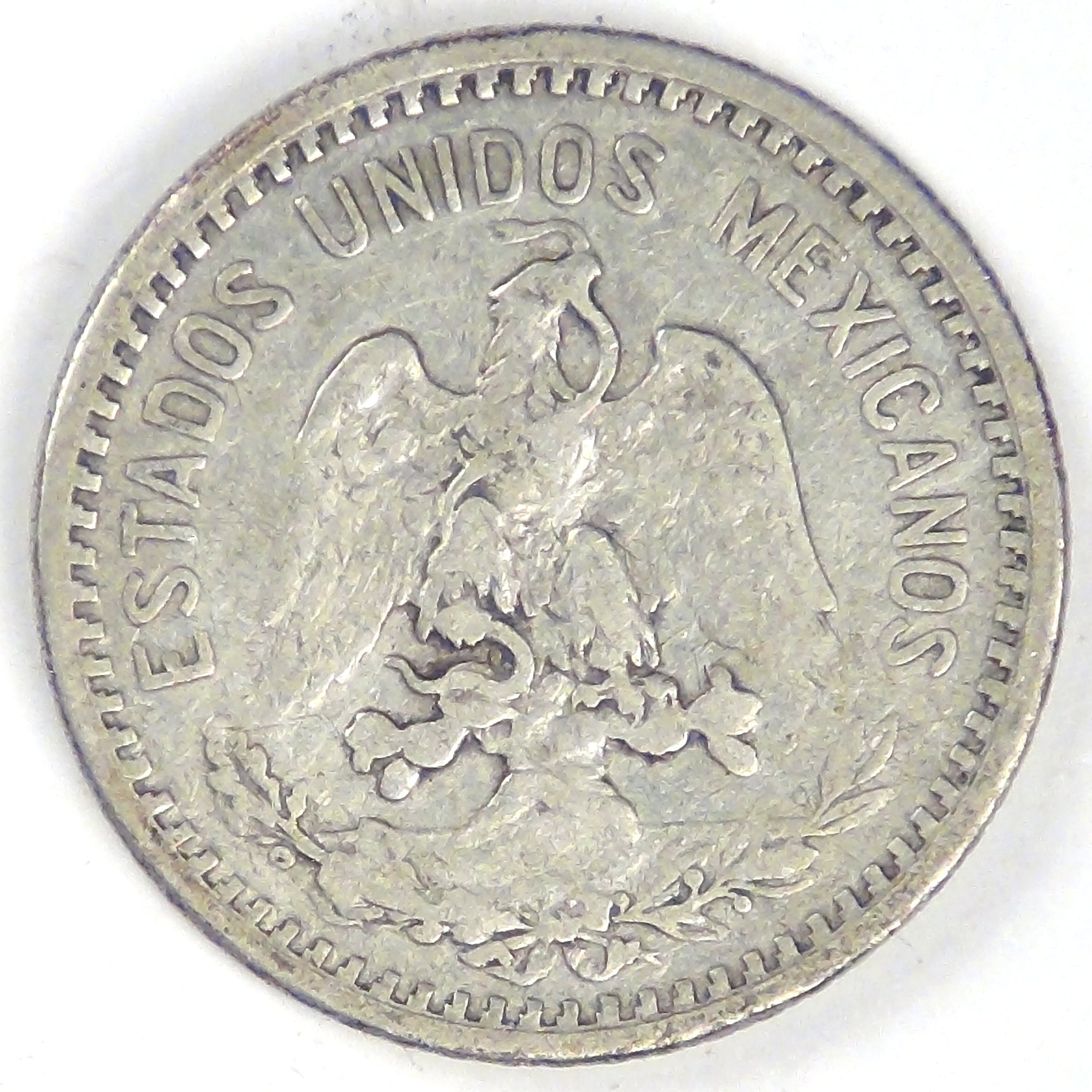 Obv: National arms (eagle left with snake in beak, standing on cactus with laurel and oak branches at bottom) with the legend “United Mexican States” around