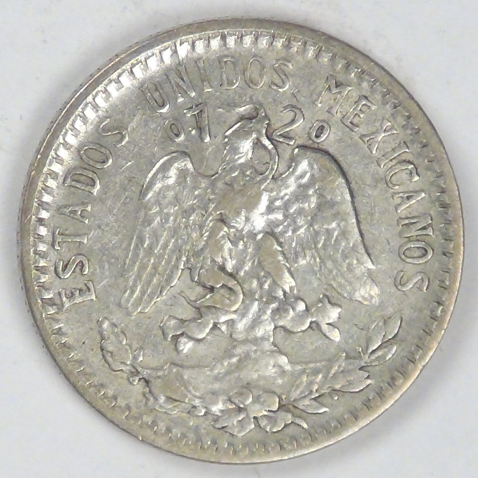 Obv: National arms (eagle left with snake in beak, standing on cactus with laurel and oak branches at bottom) with the legend “United Mexican States” around, eagle’s head divides fineness
