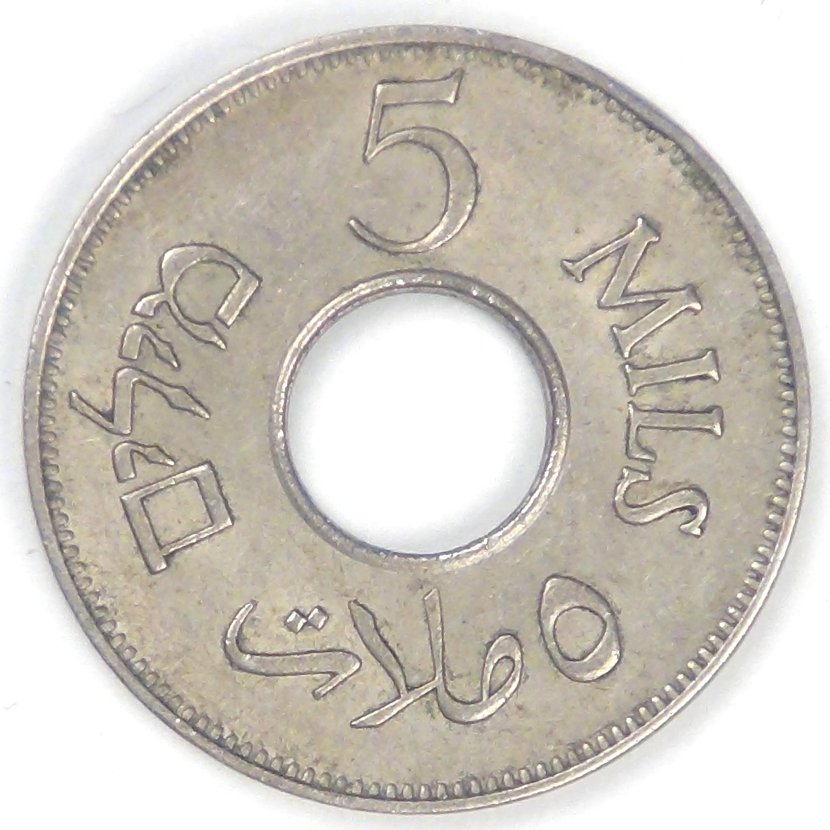 Obv: Central hole, encircled by a stylized olive wreath surrounded by “Palestine" in Hebrew, English and Arabic with date in English and Arabic below