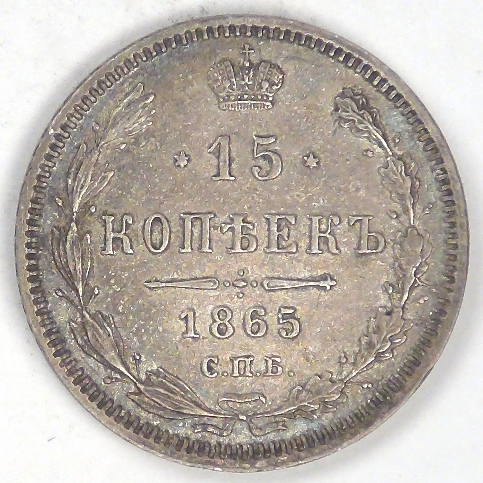 RUSSIA - Empire, Alexander II, 1865 СПБ НФ, 15 Kopeks, Almost Uncirculated