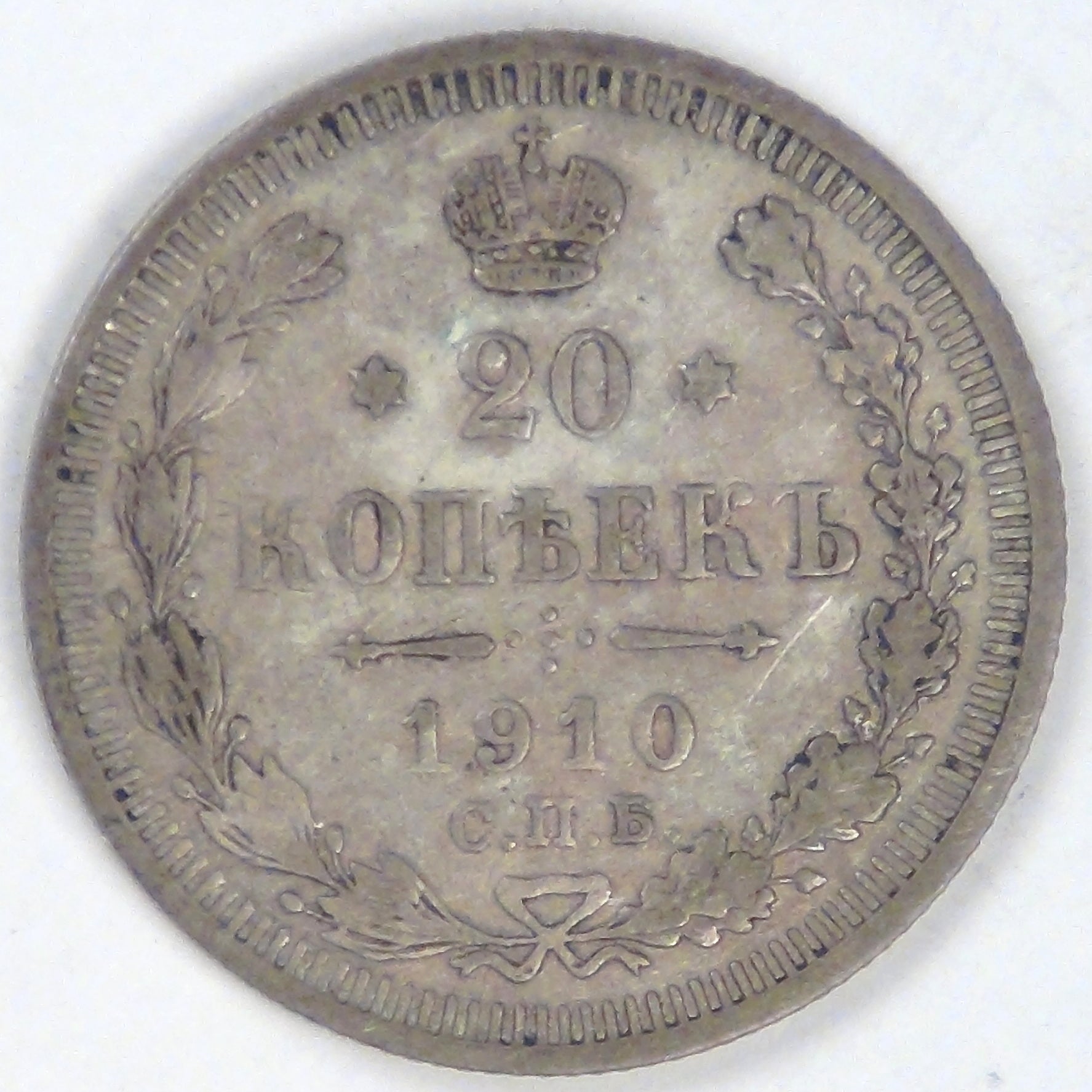 RUSSIA - Empire, Nicholas II, 1910 СПБ ЗБ, 20 Kopeks, Choice Very Fine