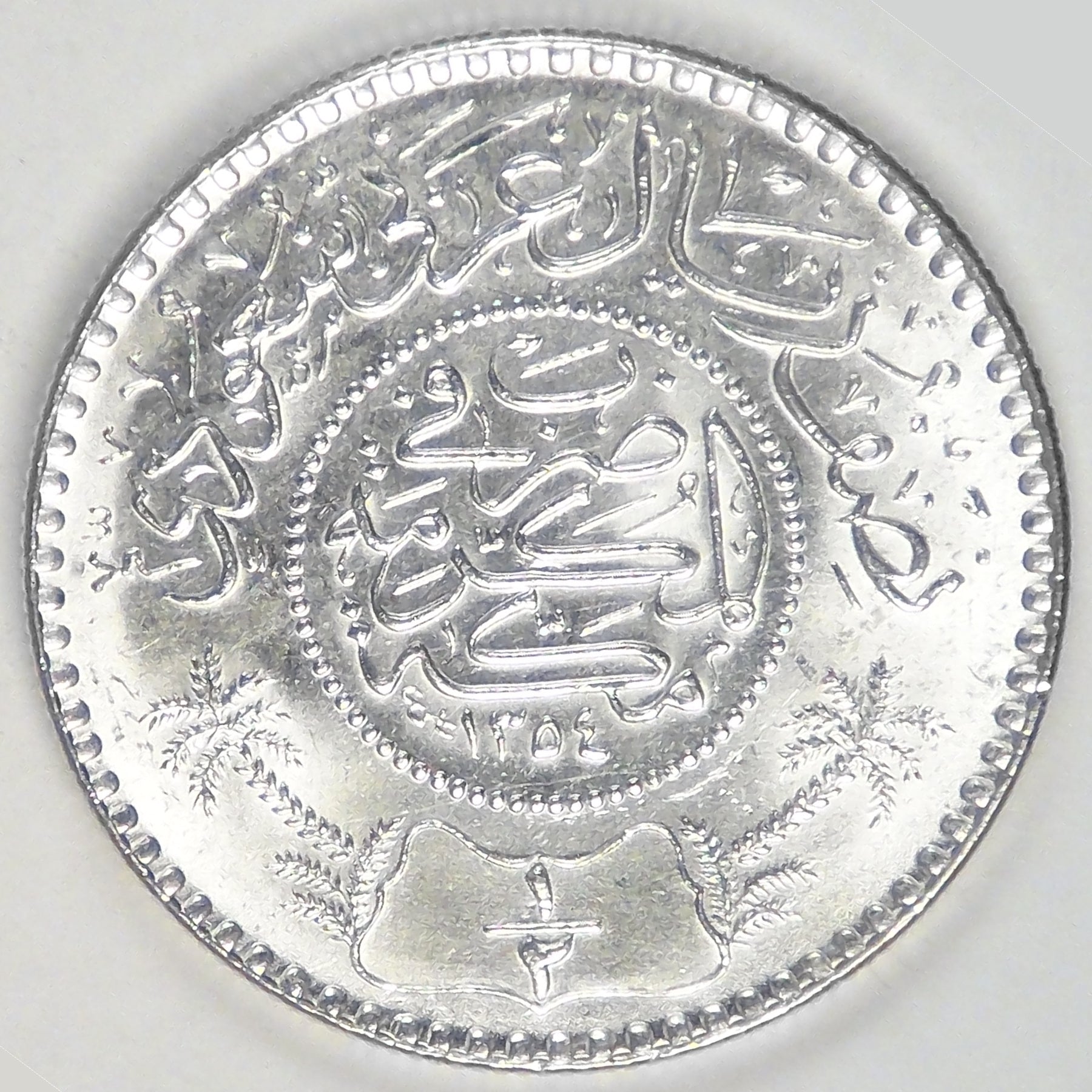 Rev: Arabic inscription “Struck in Mecca” within beaded circle with the legend “Half a Saudi Arabian riyal” above and numerical value below within design flanked by palm trees