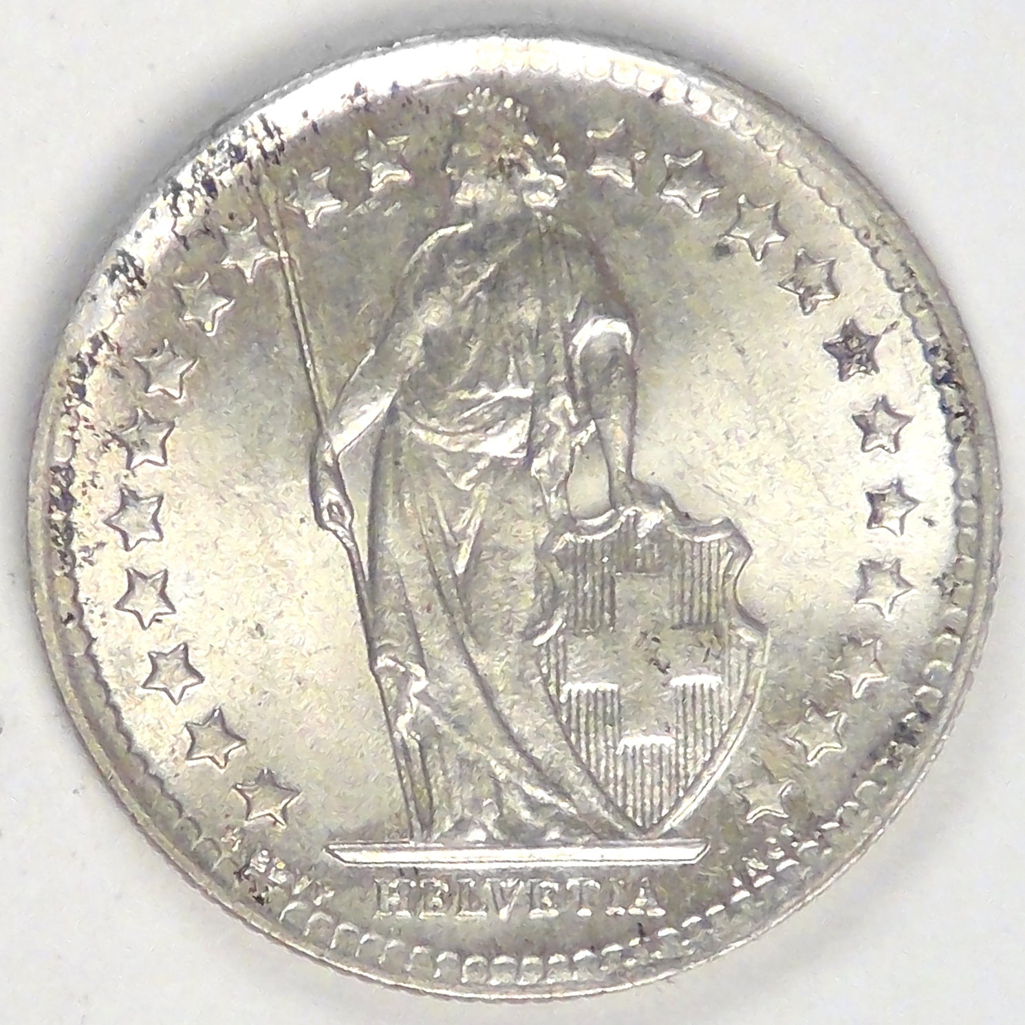 Obv: Full-length figure of Helvetia, standing, facing left, wearing toga, holding spear in right hand and supporting shield with coat of arm in left, 22 starts around representing the cantons of the Swiss Confederation, with “Switzerland” in exergue